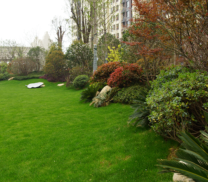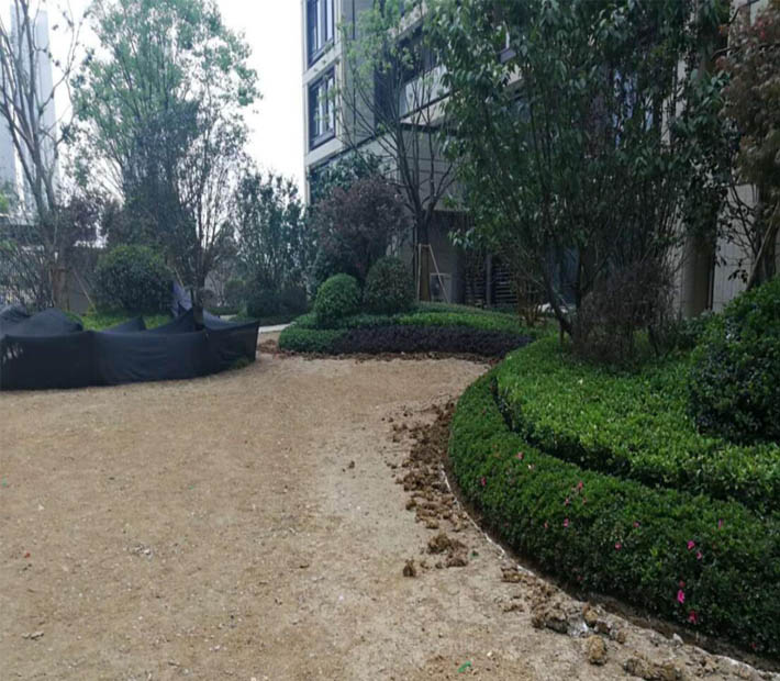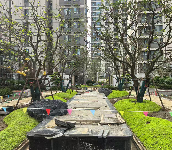 本项目景观面积大约2万平方,其中运用了移栽大香樟,红梅,大桂花等珍贵苗木,景观水系大约600平方,采用卵石铺贴。
