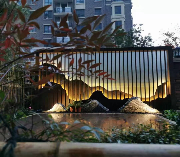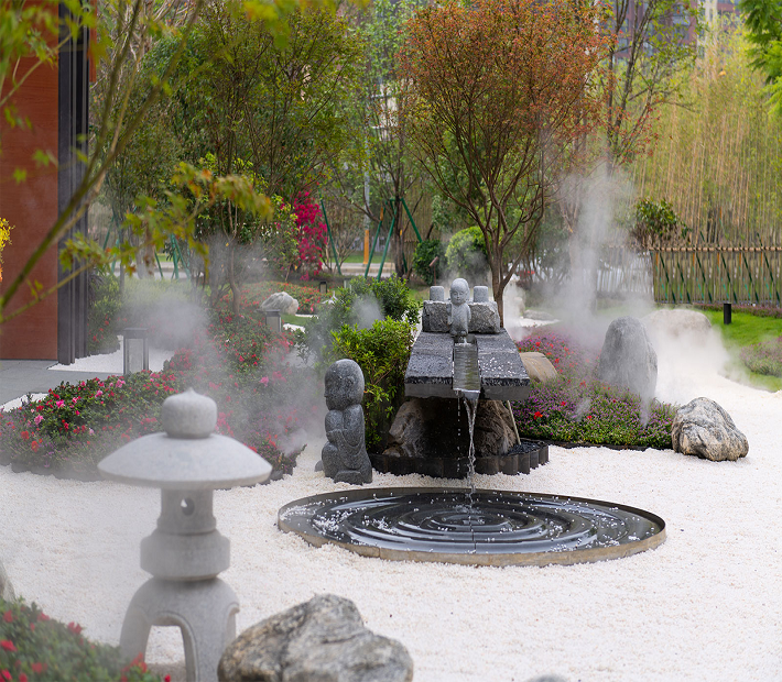 麻雀虽小五脏俱全。石笋、雪浪石组、山形景墙制造出山野围合之感。老水钵与石灯笼诉说着岁月的故事。寒武石涌泉在飘逸的红枫枝头下灵动闪耀......