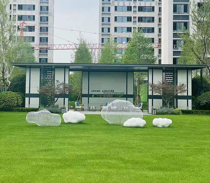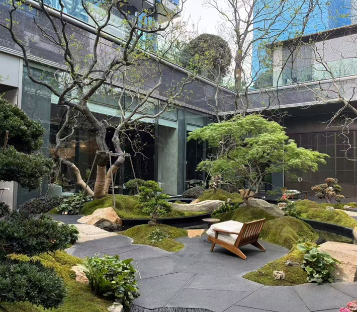 本项目景观面积大约1万平方,以现代简约风格为主,主要材料为黄金麻,主要树种为朴树、榉树、银杏等,收边苗木以紫鹃毛娟等为主。