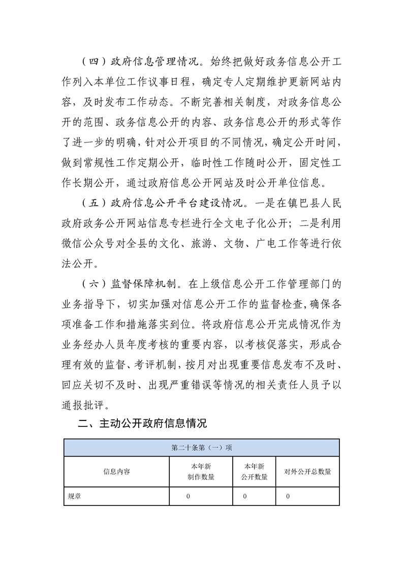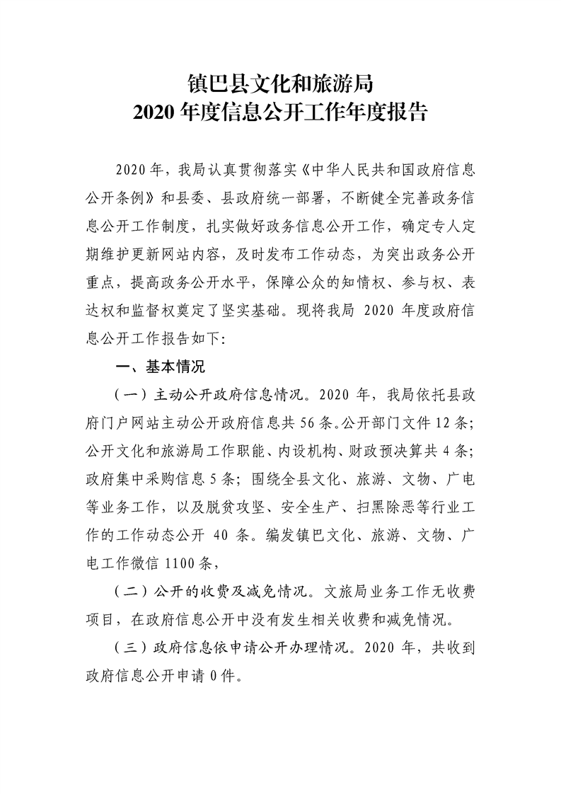 镇巴县文化和旅游局2020年度政府信息公开工作年度报告