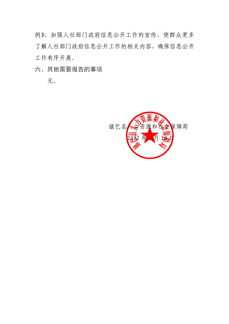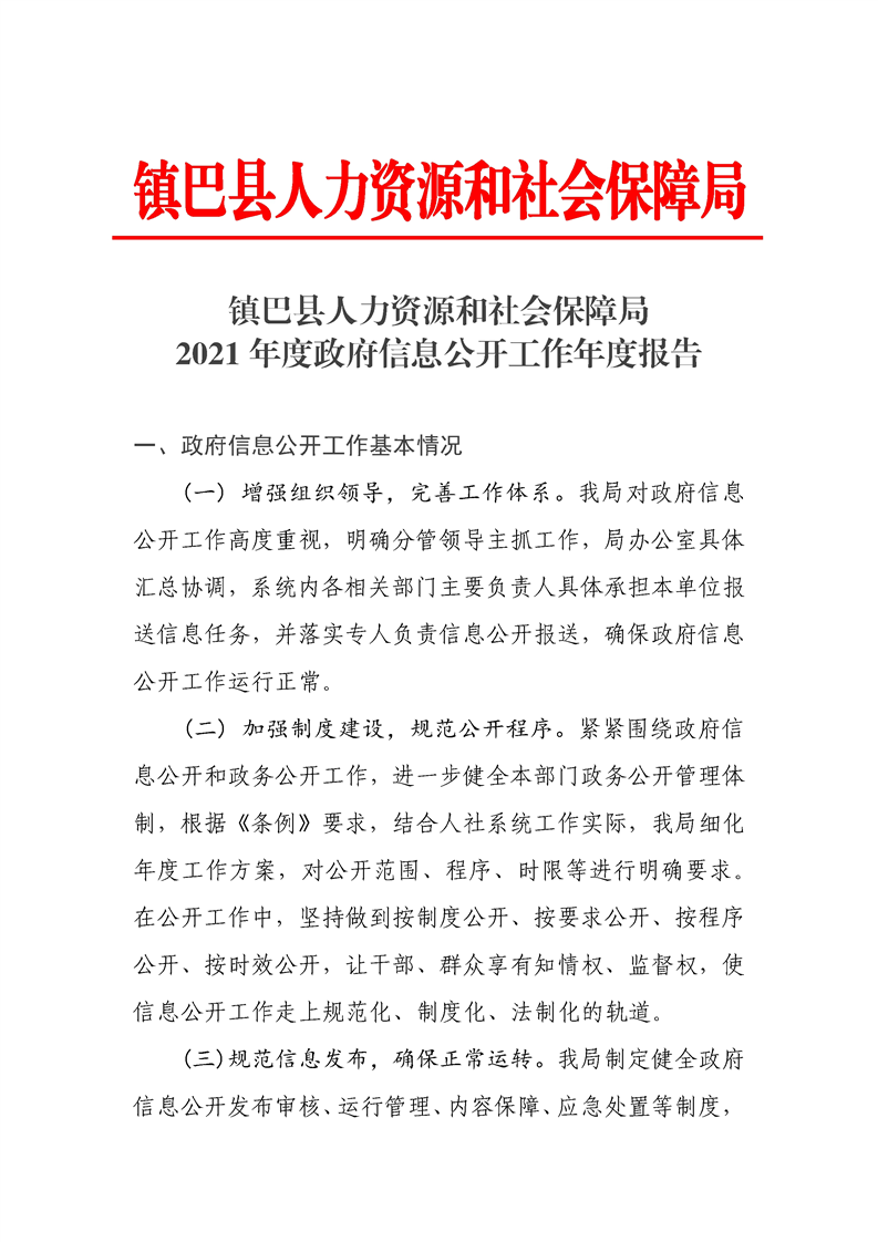 镇巴县人力资源和社会保障局2021年度政府信息公开工作年度报告