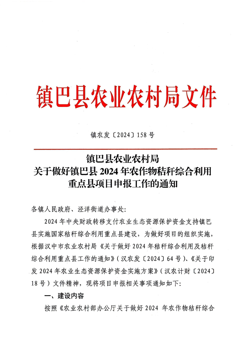镇巴县农业农村局关于做好镇巴县2024年农作物秸秆综合利用重点县项目申报工作的通知