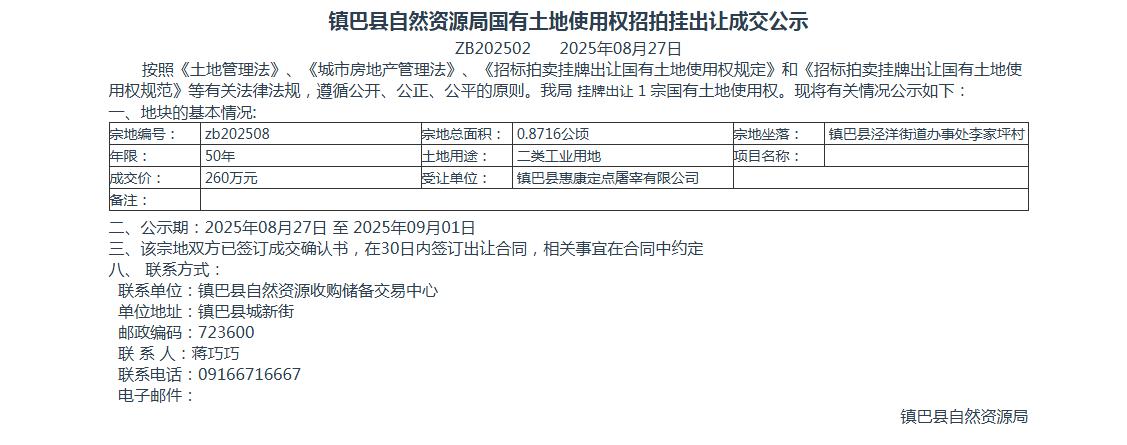 镇巴县自然资源局国有土地使用权招拍挂出让成交公示