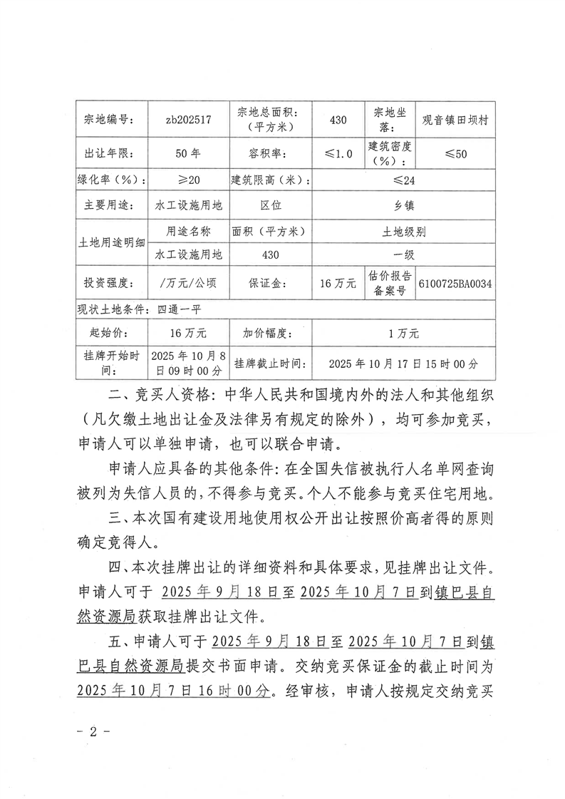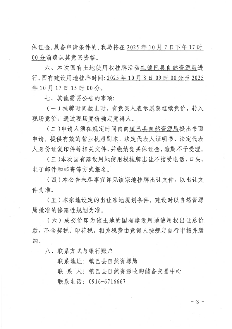 镇巴县自然资源局国有建设用地使用权挂牌出让公告