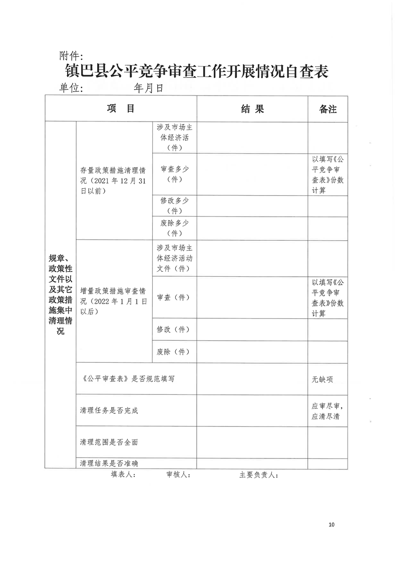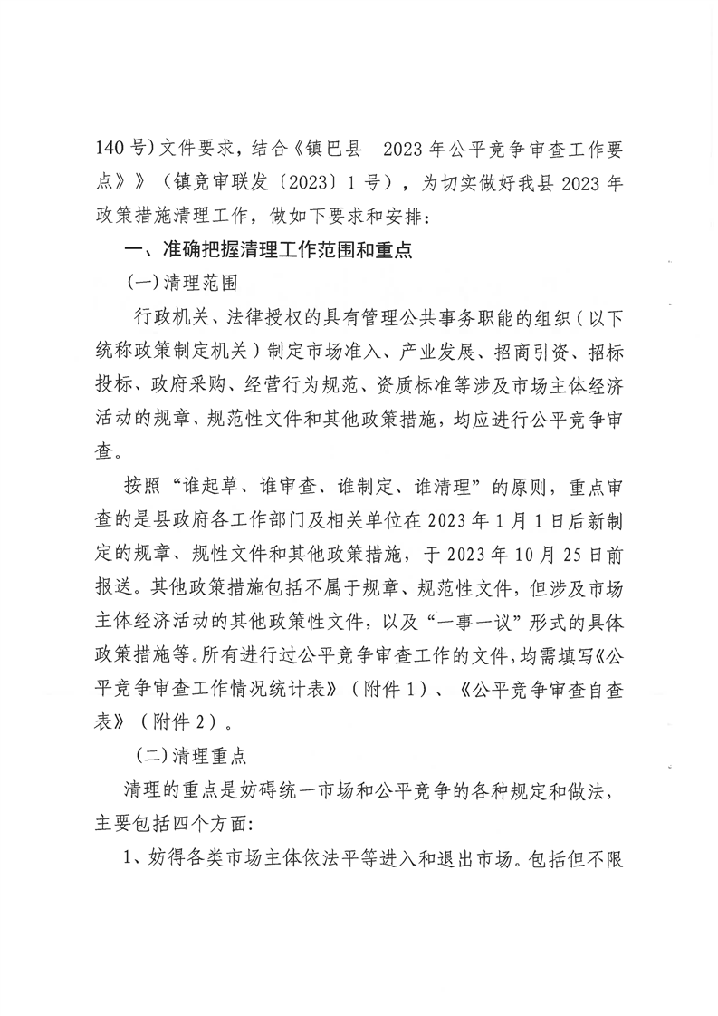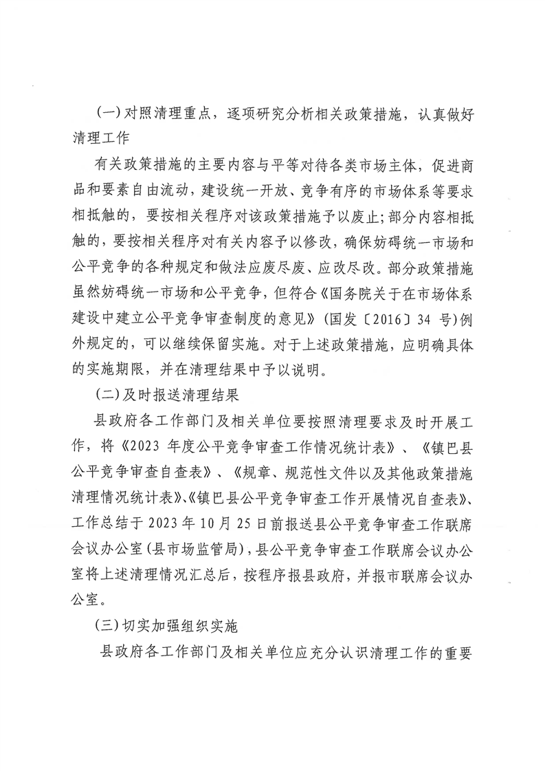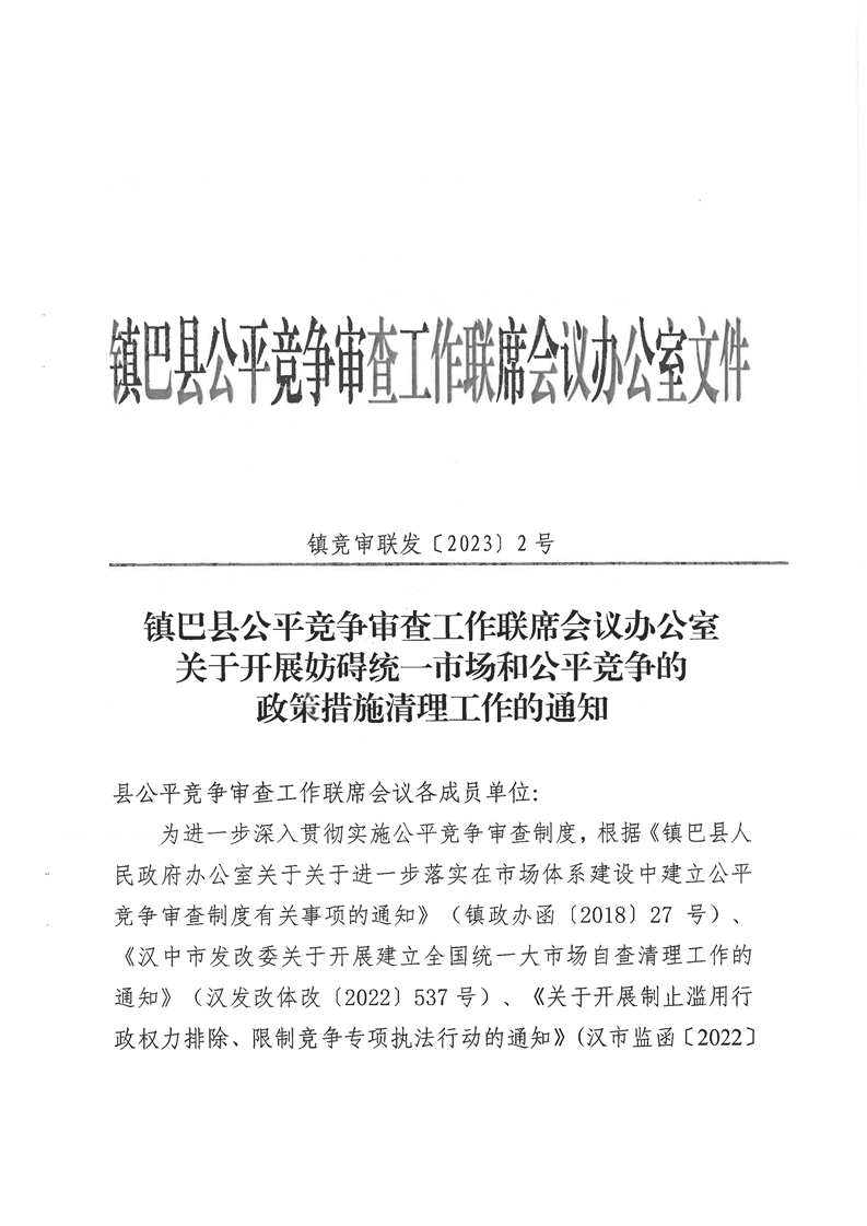 镇巴县公平竞争审查工作联席会议办公室关于开展妨碍统一市场和公平竞争的政策措施清理工作的通知
