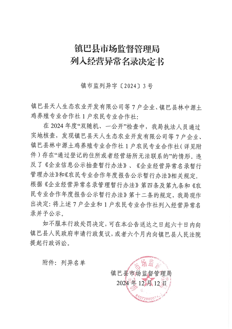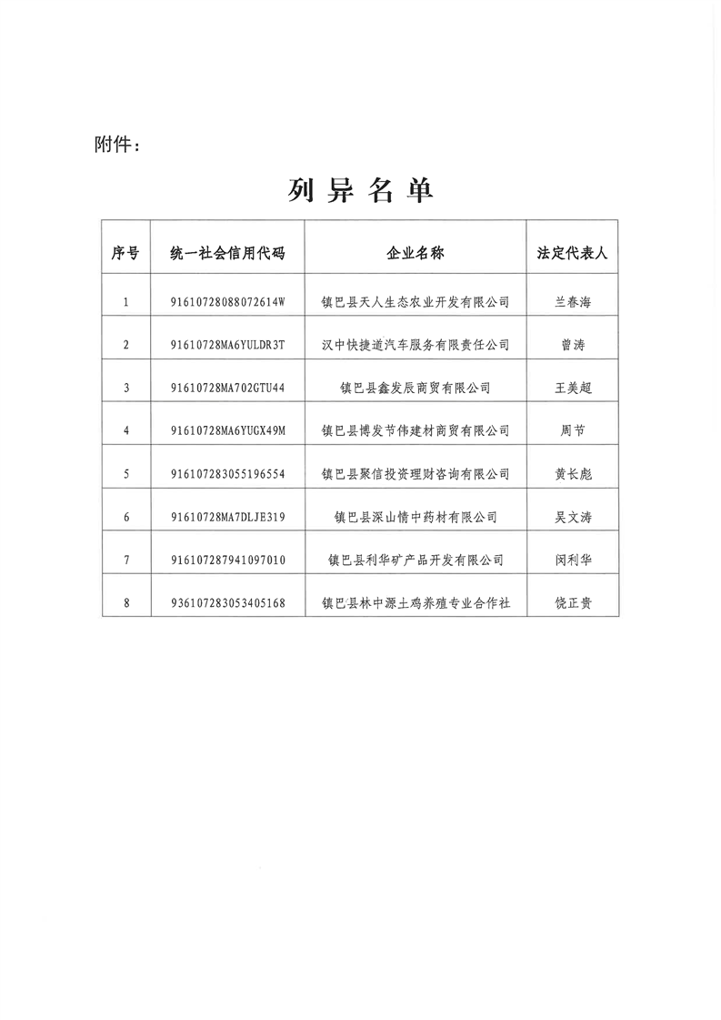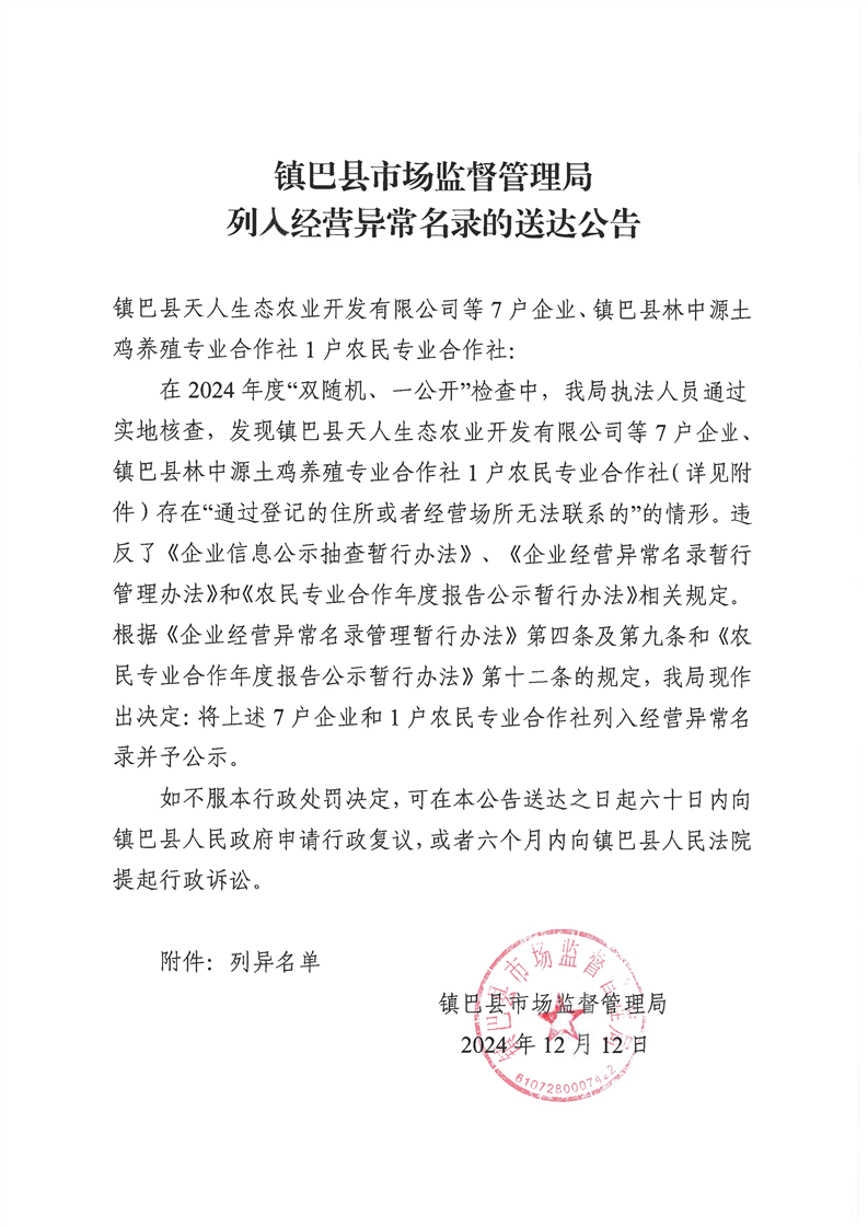 镇巴县市场监督管理局列入经营异常名录的送达公告