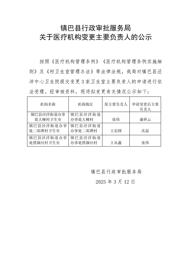 镇巴县行政审批服务局关于医疗机构变更主要负责人的公示