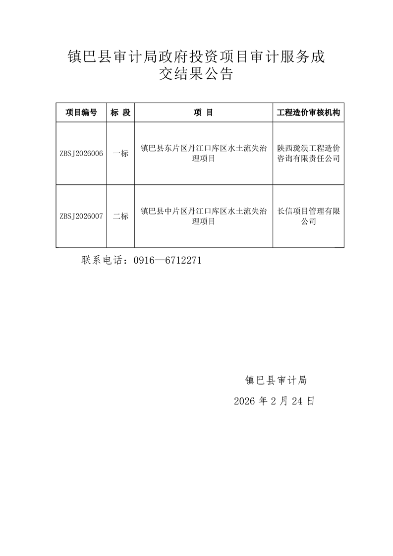 镇巴县审计局政府投资项目审计服务成交结果公告