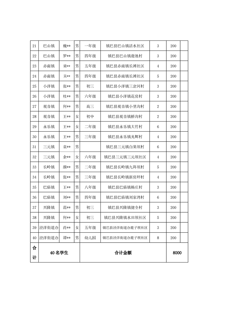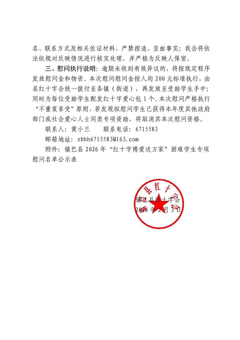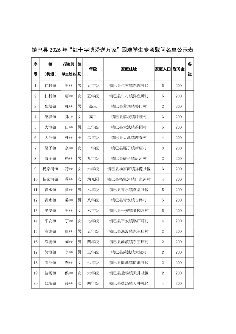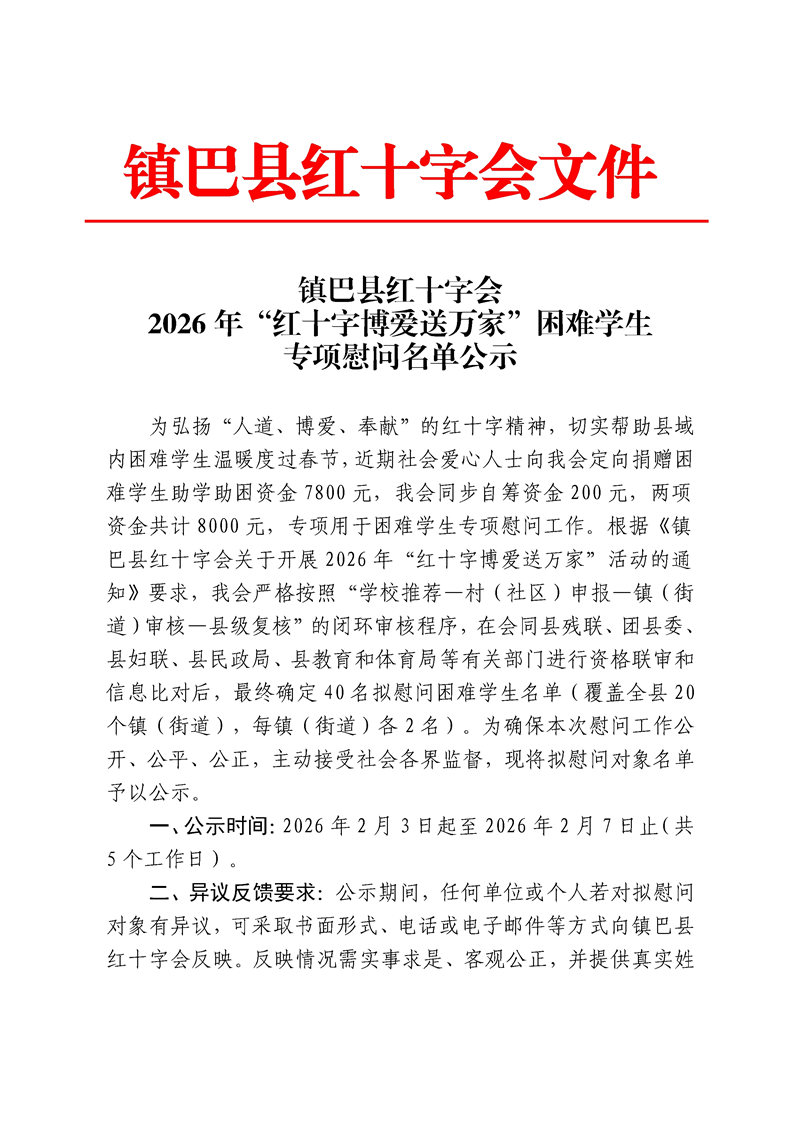 镇巴县红十字会2026年“红十字博爱送万家”困难学生专项慰问名单公示