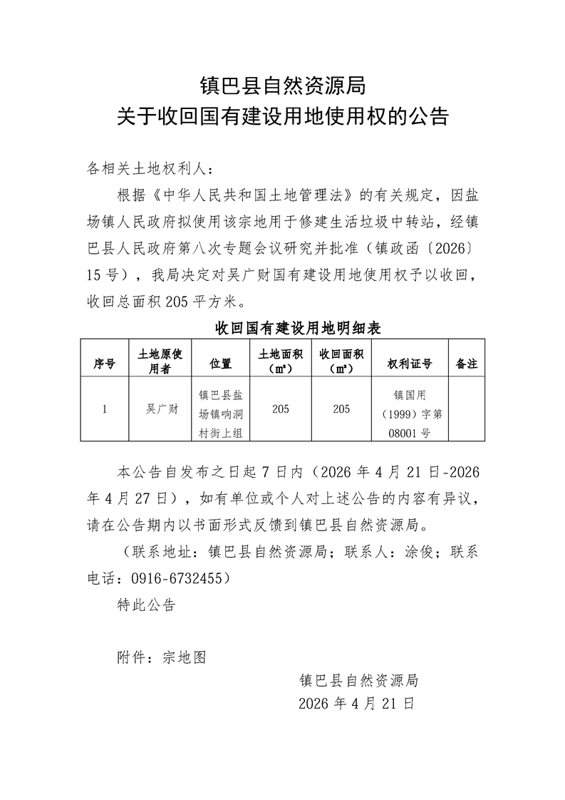 镇巴县自然资源局关于收回国有建设用地使用权的公告