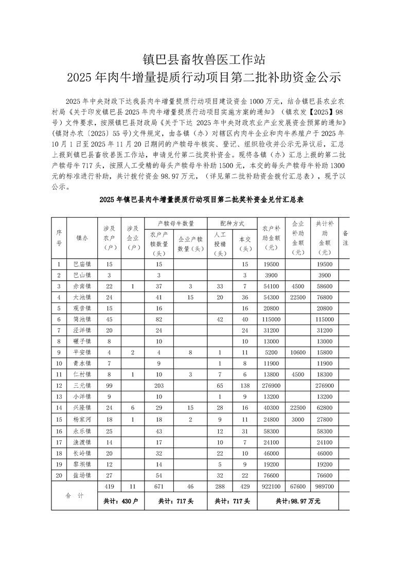 镇巴县畜牧兽医工作站2025年肉牛增量提质行动项目第二批补助资金公示