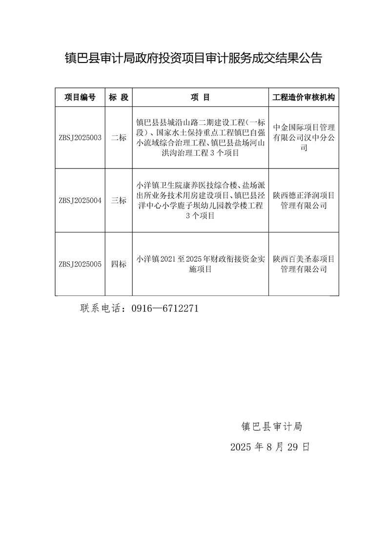 镇巴县审计局政府投资项目审计服务成交结果公告