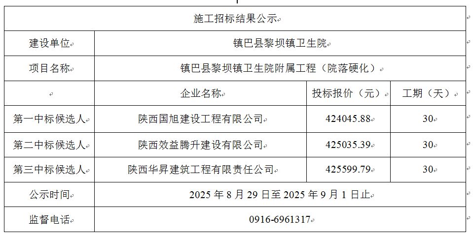 镇巴县黎坝镇卫生院附属工程(院落硬化)施工评标结果公示