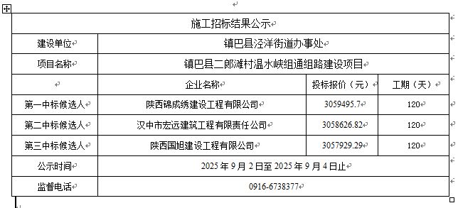 镇巴县二郎滩村温水峡组通组路建设项目施工评标结果公示