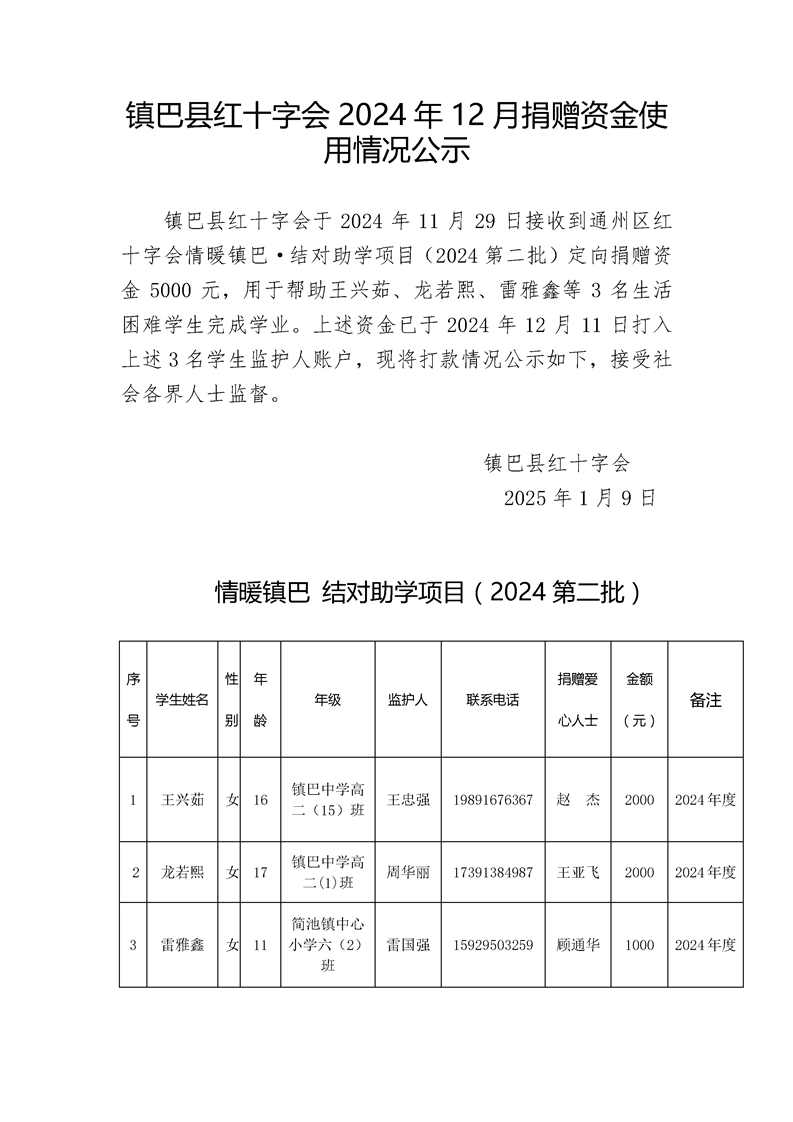 镇巴县红十字会2024年12月捐赠资金使用情况公示