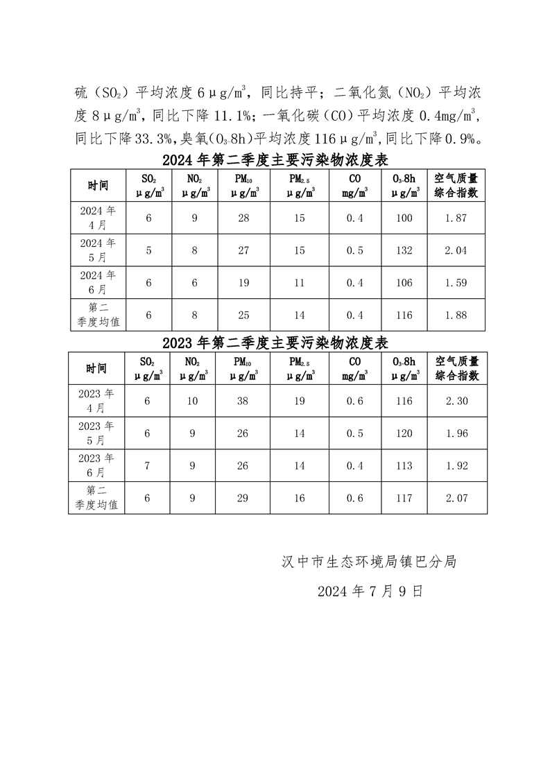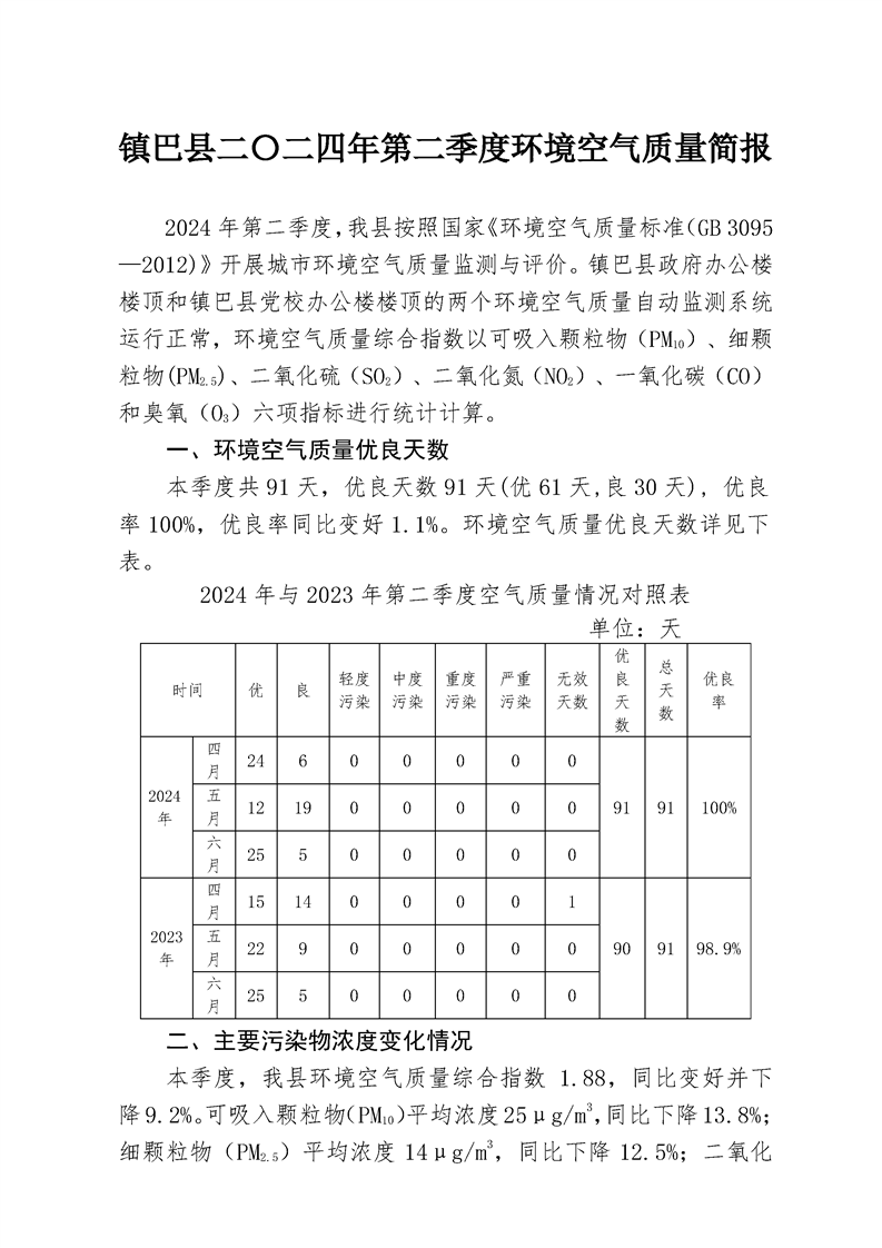 镇巴县二〇二四年第二季度环境空气质量简报