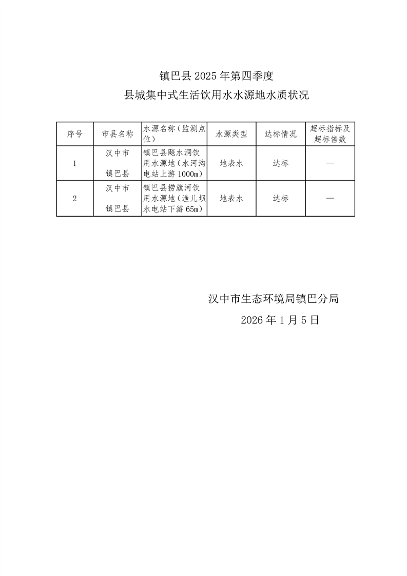 镇巴县二〇二五年第四季度县城集中式生活饮用水水源地水质监测简报