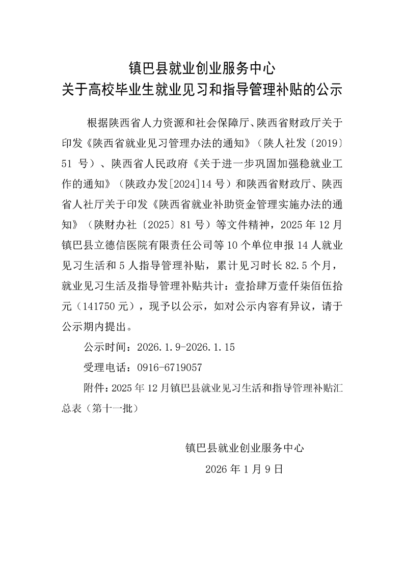 镇巴县就业创业服务中心关于高校毕业生就业见习和指导管理补贴的公示