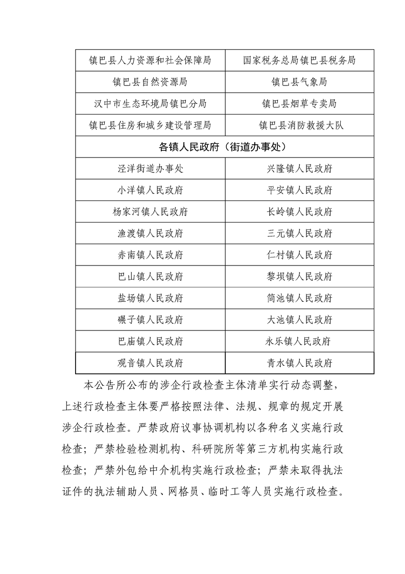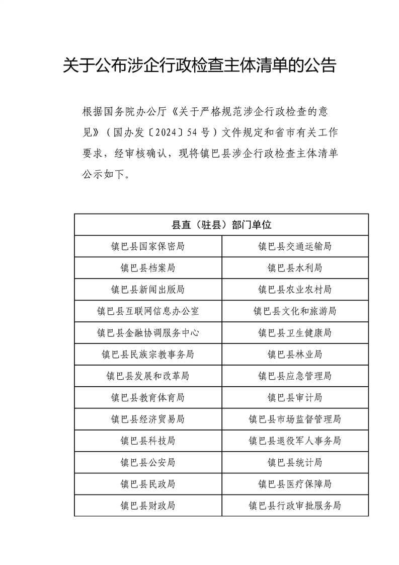关于公布涉企行政检查主体清单的公告