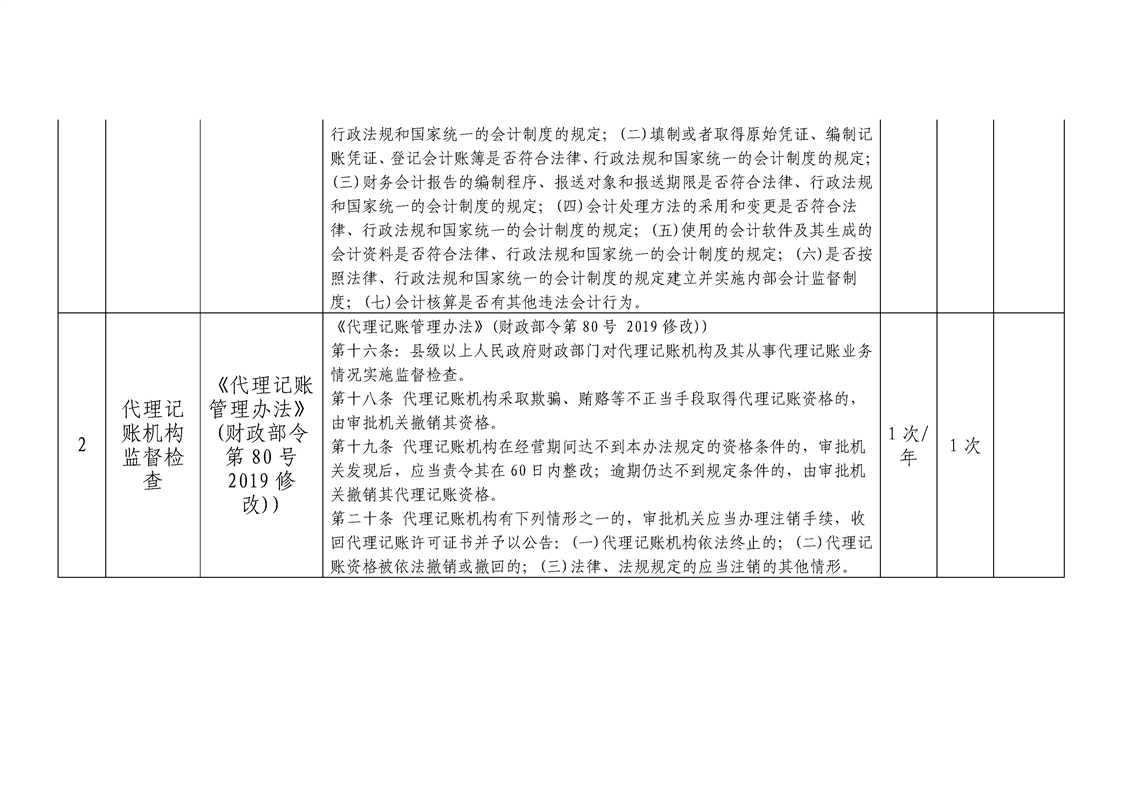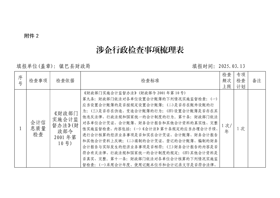 财政局涉企行政检查事项梳理表