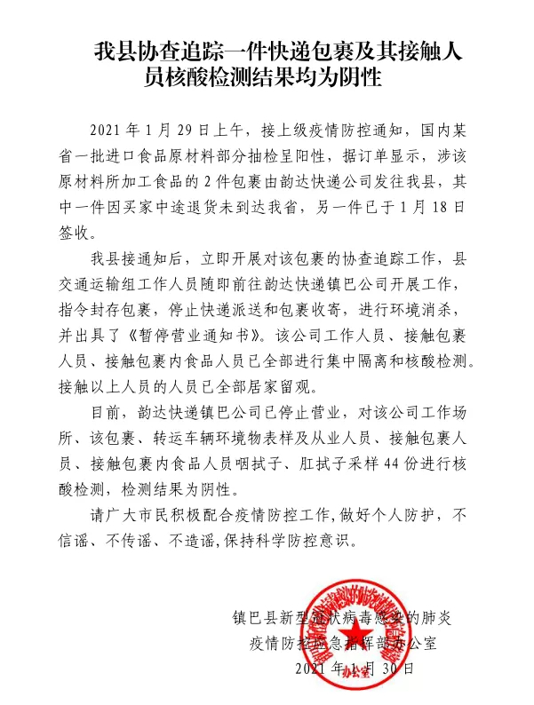 我县协查追踪一件快递包裹及其接触人员核酸检测结果均为阴性
