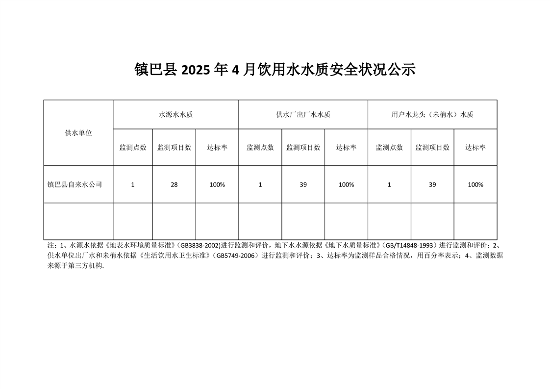 镇巴县2025年4月饮用水水质安全状况公示