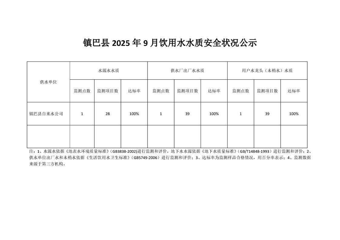 镇巴县2025年9月饮用水水质安全状况公示