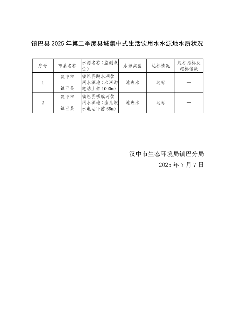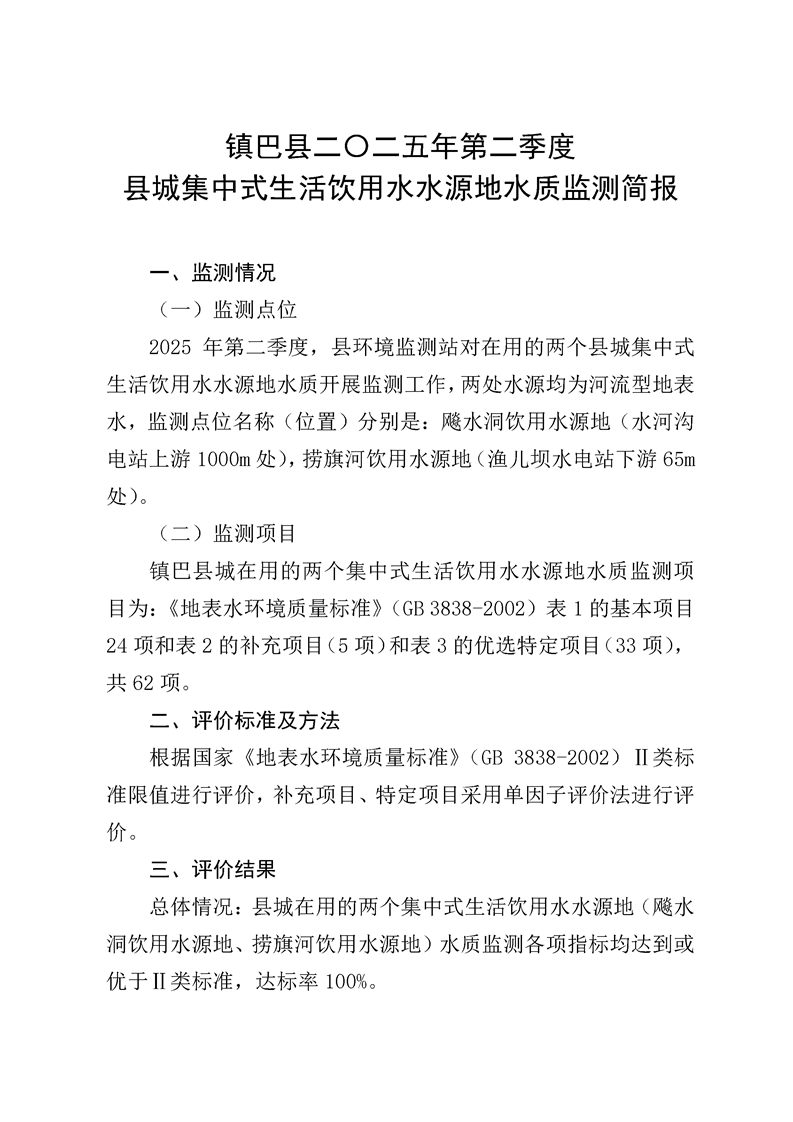 镇巴县二〇二五年第二季度县城集中式生活饮用水水源地水质监测简报