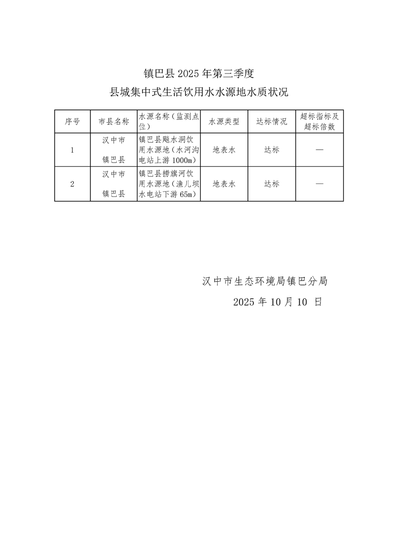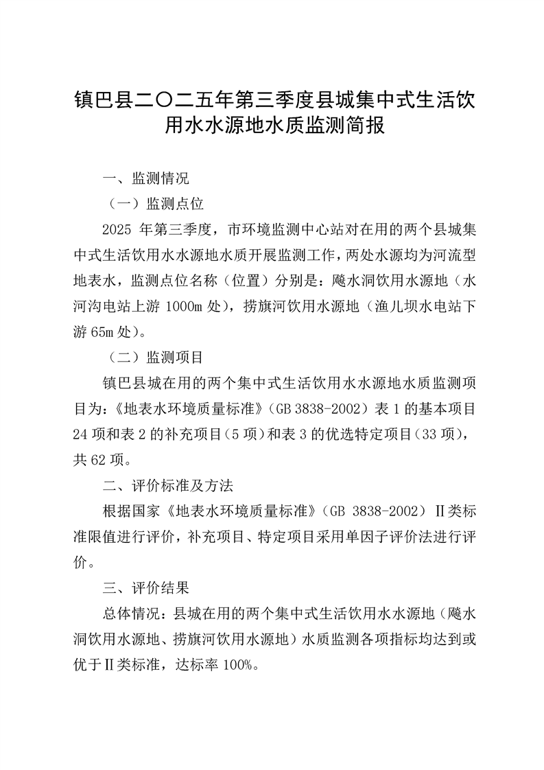 镇巴县二〇二五年第三季度县城集中式生活饮用水水源地水质监测简报
