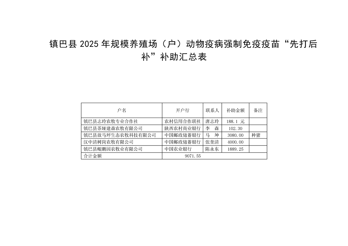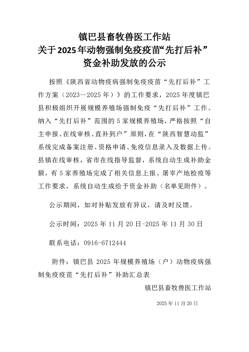 镇巴县畜牧兽医工作站关于2025年动物强制免疫疫苗“先打后补”资金补助发放的公示