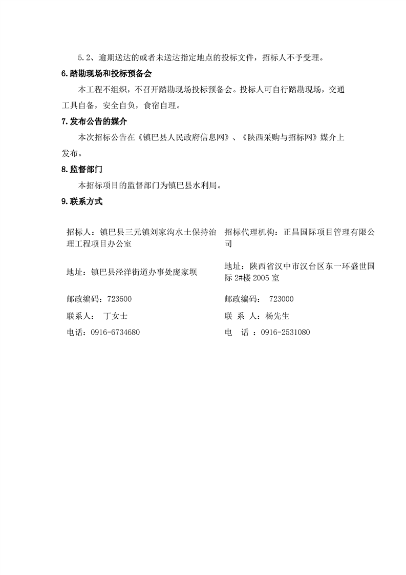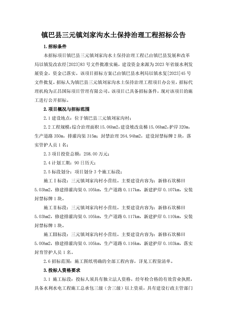 镇巴县三元镇刘家沟水土保持治理工程招标公告