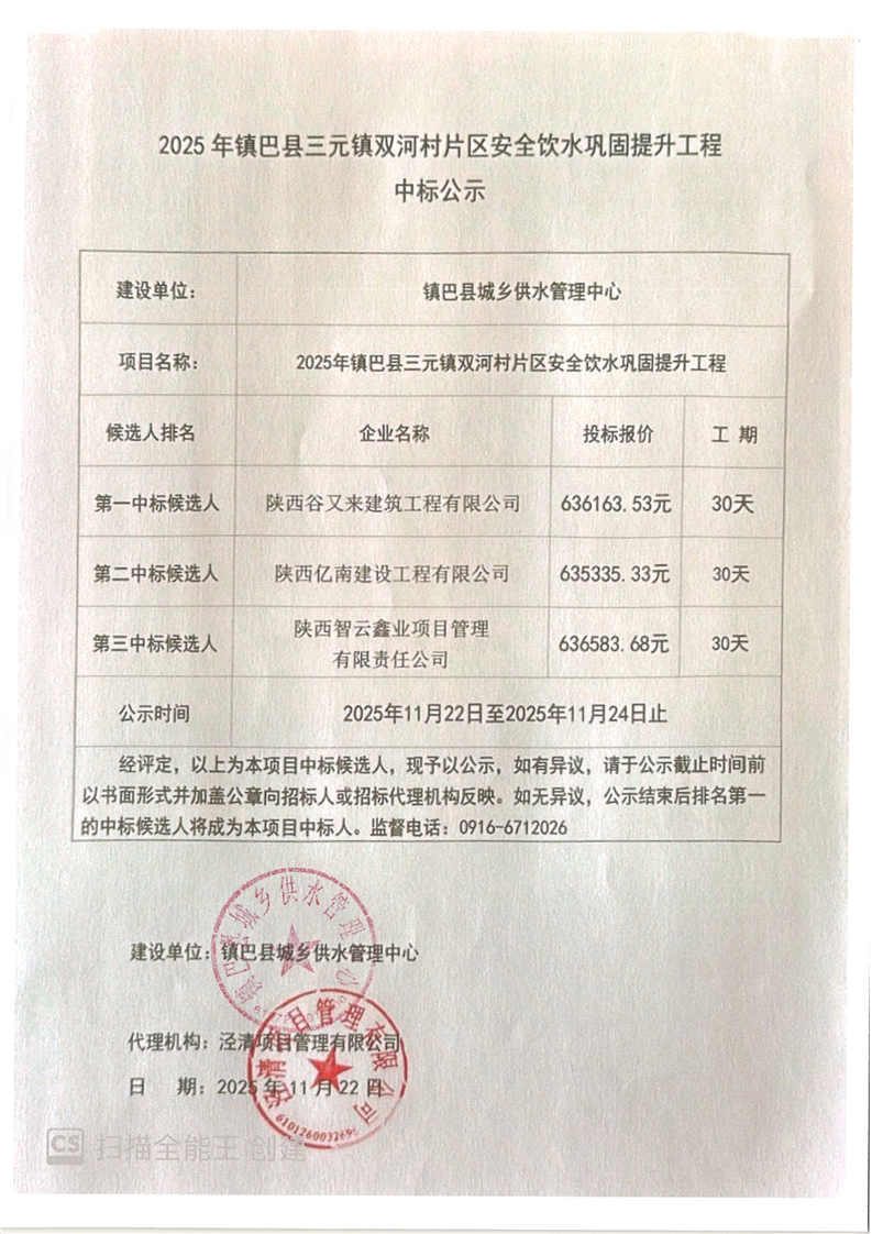 2025 年镇巴县三元镇双河村片区安全饮水巩固提升工程中标公示