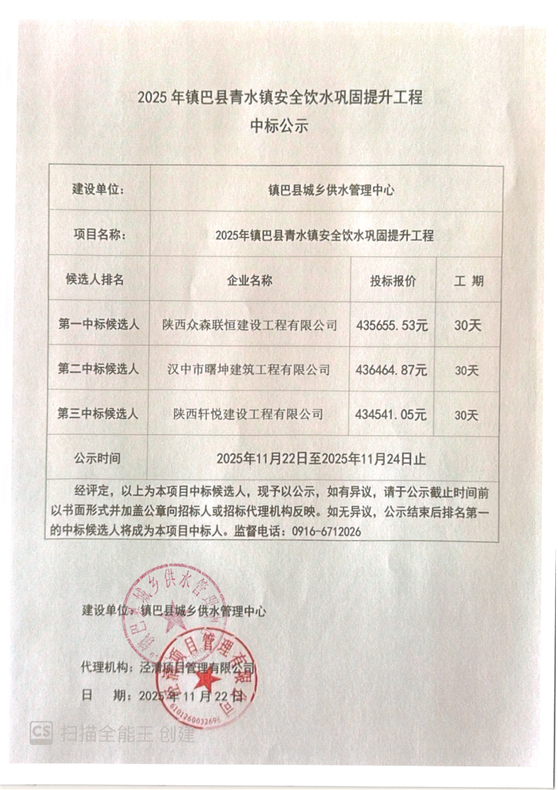2025 年镇巴县青水镇安全饮水巩固提升工程中标公示