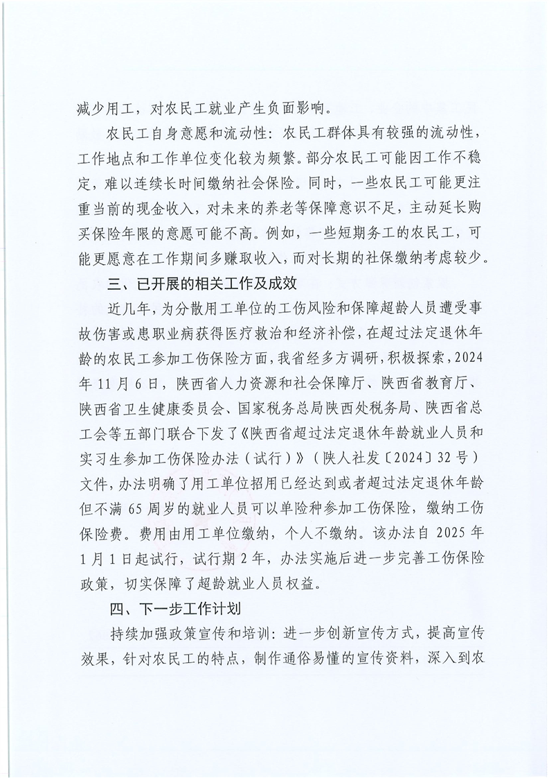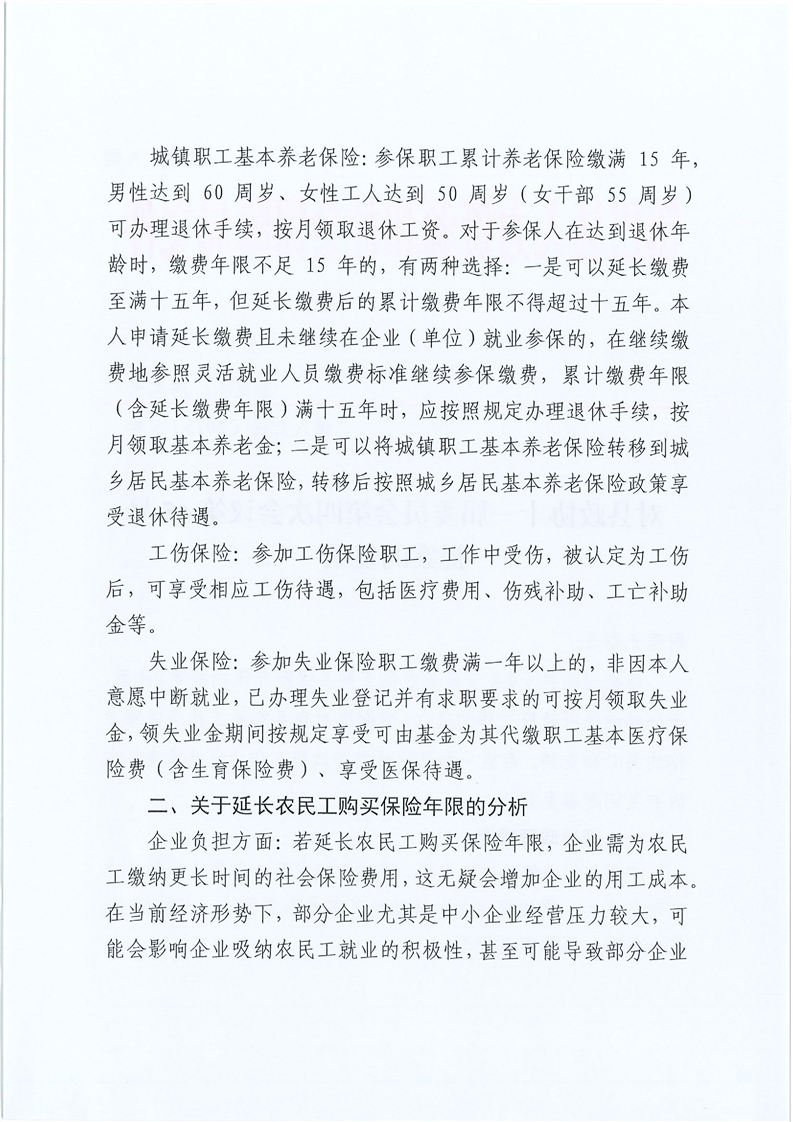 当前,随着人口老龄化问题持续加重,社会劳动力大幅减员,企业招工用工愈来愈难,特别是年满60周岁之后的农村劳动力,大多数人既具备劳动能力,但企业用工时无法购买各类保险,导致企业招工用工难,这些适龄人员想劳动养家也难以实现。按国家新的延迟退休政策,建议政府加强研究,将民企使用农民工购买保险的年龄适当延长至65周岁,既解决民企用工难,又解决高龄农民工挣钱养家糊口问题。
